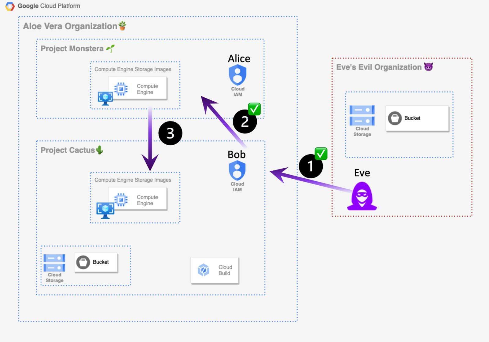In order to exfiltrate the sensitive compute images from the Aloe Vera account to Eve’s account, Step 4 involves exporting the image to a Google storage bucket in The Cactus Project. Eve uses Bob’s access to Cactus project GCP account, and Bob is a developer that uses Google APIs.