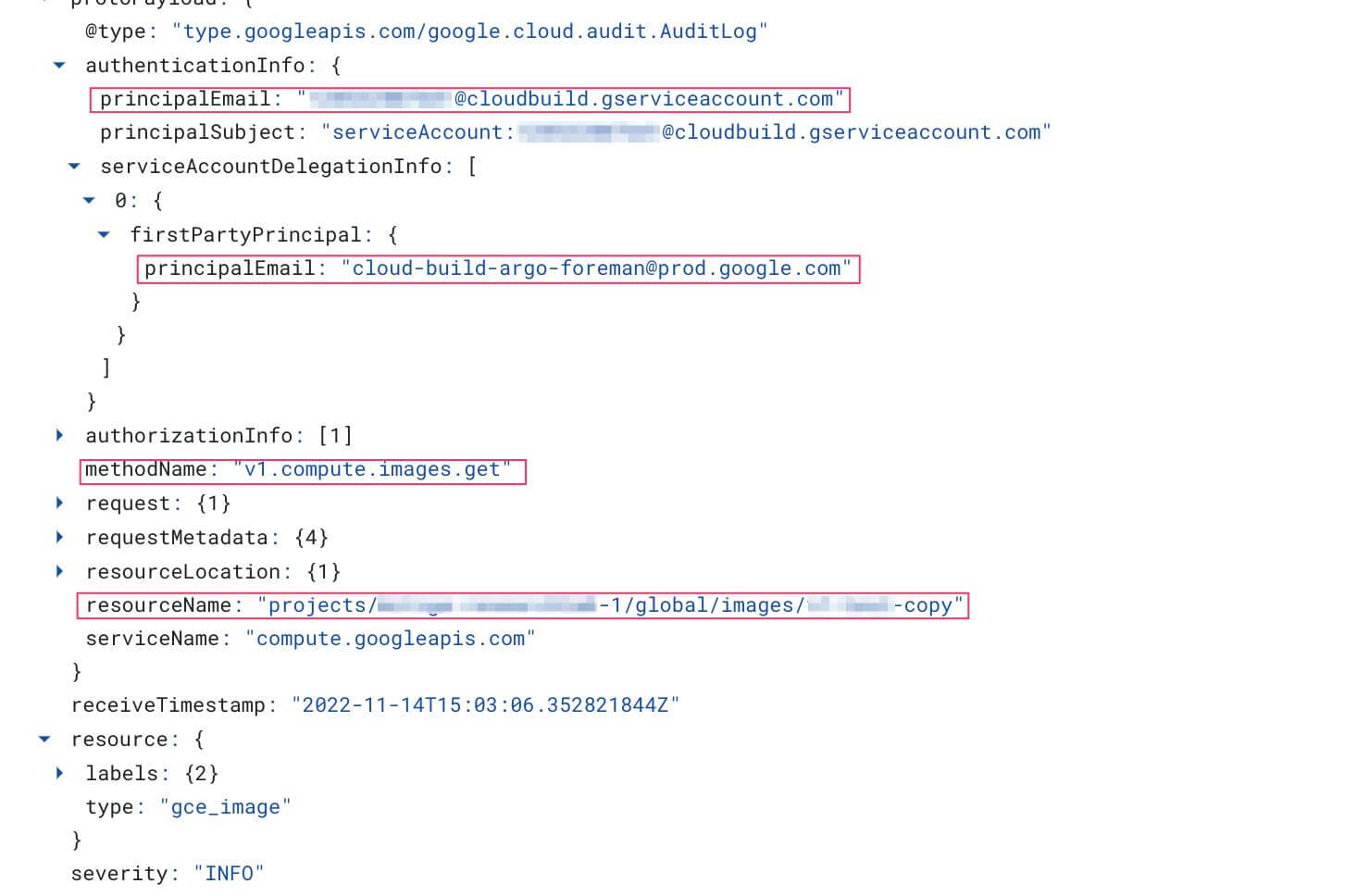 Cloud build can be used to perform a wide range of actions — even when performing a single task (e.g., export Compute Image to Google Cloud Storage Bucket), a lot of events are going to be generated behind the scenes, so the first method that indicates the export and the involved image is compute.images.get. We can see that the entity that performed the request (principalEmail field) is “cloudbuild”: