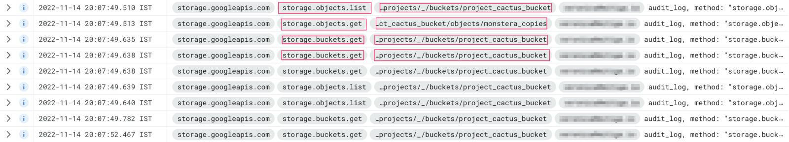 Another problem that arises: When Aloe Vera’s security team tries to investigate the exfiltration event, they will encounter GCP logging at some point. Upon looking at the logs describing the copy of the data from The Cactus Project’s Storage Bucket to Eve’s external account, the GCP logs do not cover how the Google storage destination was copied, because Eve’s attacker bucket is absent from the logs.