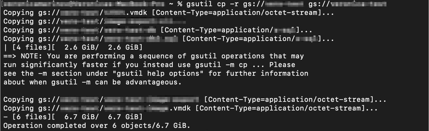 Google has a CLI dedicated to storage methods called “gsutil”. Using the “cp” command with the “-r” flag, Eve recursively copies the content of a bucket to her external Google Storage bucket within GCP: