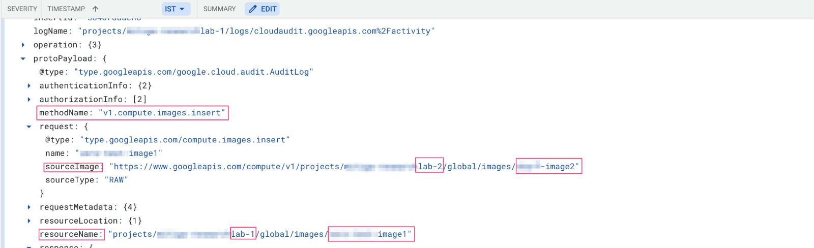 We can see that the sourceImage path contains "lab-2" while the resourceName path contains “lab-1,” which means a Compute Image was successfully created cross-project. In order to detect this activity, we will search for the an v1.compute.images.insert event, in which the project name in the sourceImage and the project name in the resourceName are different.