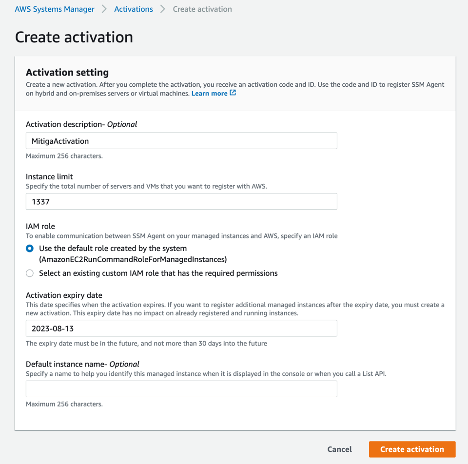 Before launching the attack on the endpoint, the attacker, within their malicious AWS account, generates a hybrid activation. Upon generation, the attacker obtains an activation code and activation ID and the region where the activation was generated. The attacker must then find some independent means by which to gain access to and root privileges on the EC2 instance subject to the attack. Then, using the values obtained for hybrid activation, the attacker can register the victim's SSM agent to their own AWS account using a single command line executed inside the compromised endpoint. Subsequently, the SSM agent will establish communication and execute commands from the attacker's AWS account.