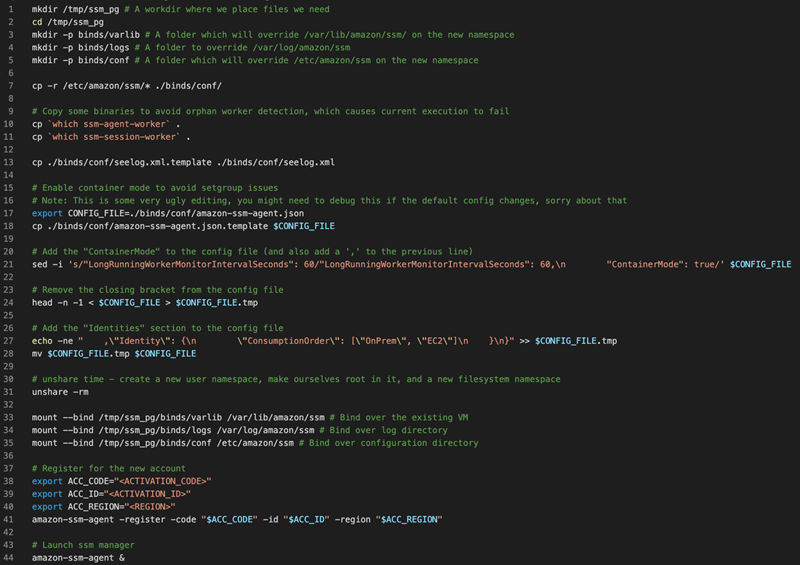 Another implementation for this scenario is running the agent in “container” mode. In this implementation the threat actor does not need root permissions! This mode exists for container instances (more about that here: https://docs.aws.amazon.com/codebuild/latest/userguide/session-manager.html).