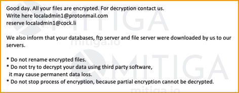 As Mitiga’s forensic analysts began investigating, they found the attackers were active in the network for at least two weeks before the encryption itself. During this time, it was determined, the attackers both established a foothold in the network and exfiltrated the sensitive data.