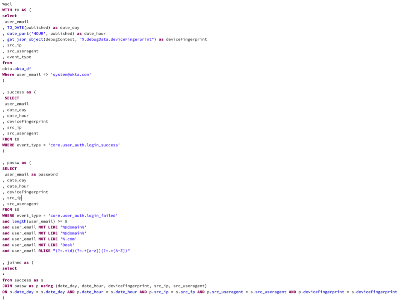 - Extract date and hour of the login attempt, device fingerprint, source IP address, and source user agent from raw Okta logs. (“t0” table)