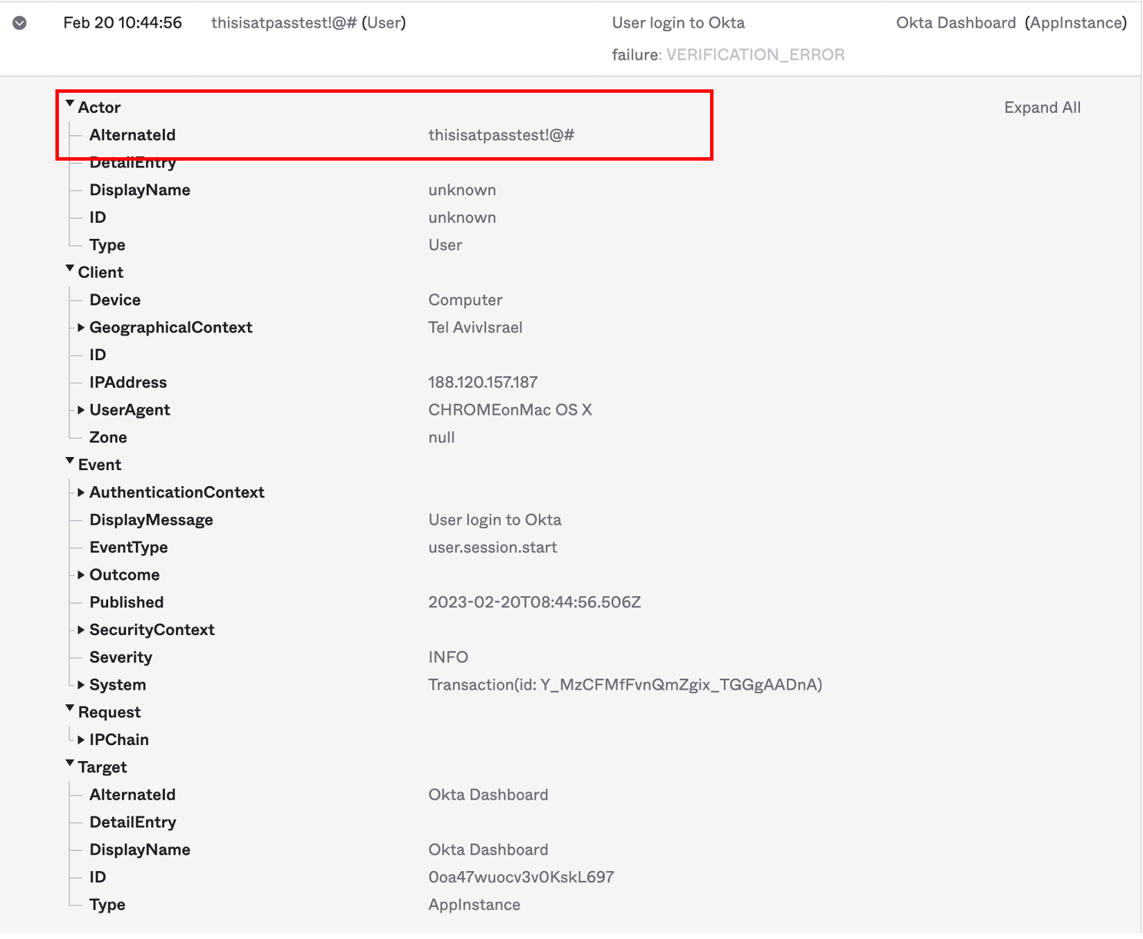 When a user logs in to their Okta domain, it's quite common for them to mistakenly enter their password in the username field on the login page, resulting in login failure. However, the unfortunate consequence of that action is that the failed login request is recorded in Okta audit logs, including the password in plain text in the username section. In most cases, users will subsequently do a successful login, registering the actual correct username in the log file.