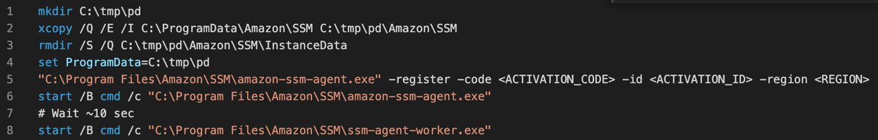'yes' | & 'C:\Program Files\Amazon\SSM\amazon-ssm-agent.exe' -register -code <ACTIVATION_CODE> -id <ACTIVATION_ID> -region <REGION>; Restart-Service AmazonSSMAgent