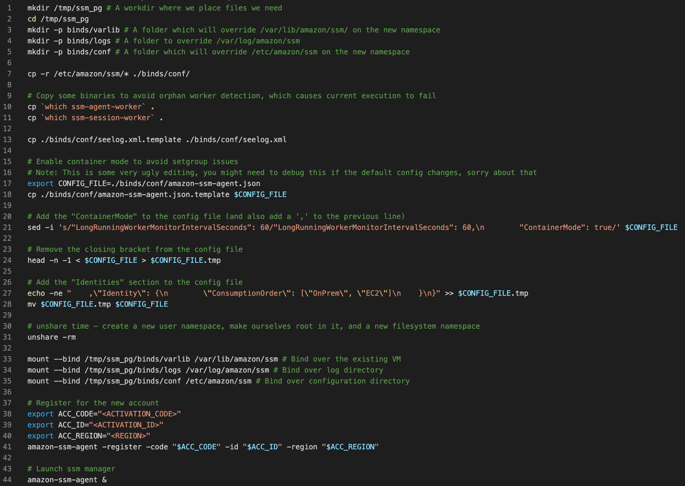 - High privileges required - To register the SSM agent successfully, the attacker would need to run with root privileges, which is not easily attainable through exploit abuse.
